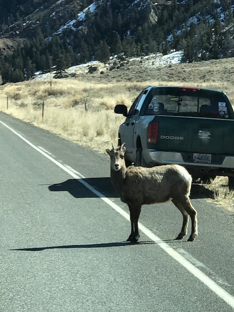 Because it is off-season for Yellowstone Park, we saw few fellows traveling the road from Cody on the Shoshone River road to the East entrance of Yellowstone. We did see a herd of big horn sheep. We saw a photographer, actually, then we saw the sheep he was pointing his camera at. The East entrance was closed for the winter, until May 3, so we returned the same way. There was the photographer, this time walking back on the hillside. One of the young sheep had walked up to the photographer’s car. I took a photo with my trusty telephone.