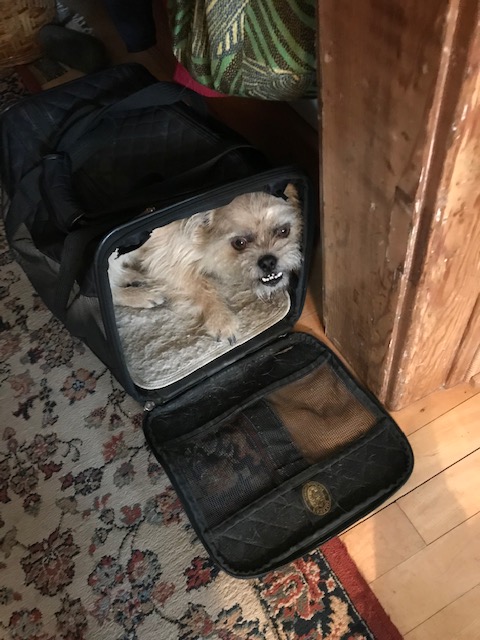 As usual, as soon as I set his soft crate near the back door, G. ran into it and hunkered. He seems to fear being left behind. Me, I dislike lugging him in his carrier all the way out to the car. He weighs almost two stone, according to his veterinarian.