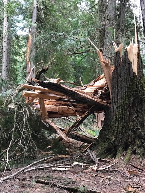Drove through to Kalispell, bought flowers at Rosaurs: Bunches of lilies. Decorated the graves of three aunts, one uncle, and grandparents. From there we drove west on US 2 to Libby, then a few miles later went south on highway 65 to the Ross Cedar Grove. Encountered a guy with a Trump hat who was with some heavily made up old women. One large cedar had freshly fallen, judging from the condition of the branches and the raw look of the splintered trunk.