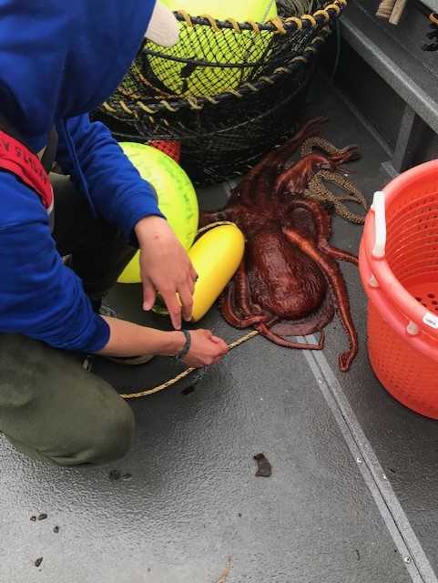 This octopus was holding onto a rather large (maybe a foot diameter) starfish. We managed to get him and his starfish out of the shrimp pot and into the bottom of the boat before one of us picked him up (perhaps 10-20 lbs, probably three feet from one tentacle tip to another. I touched him and his skin was soft. We put him overboard and, although I didn’t see it, he squirted ink as he jetted away.