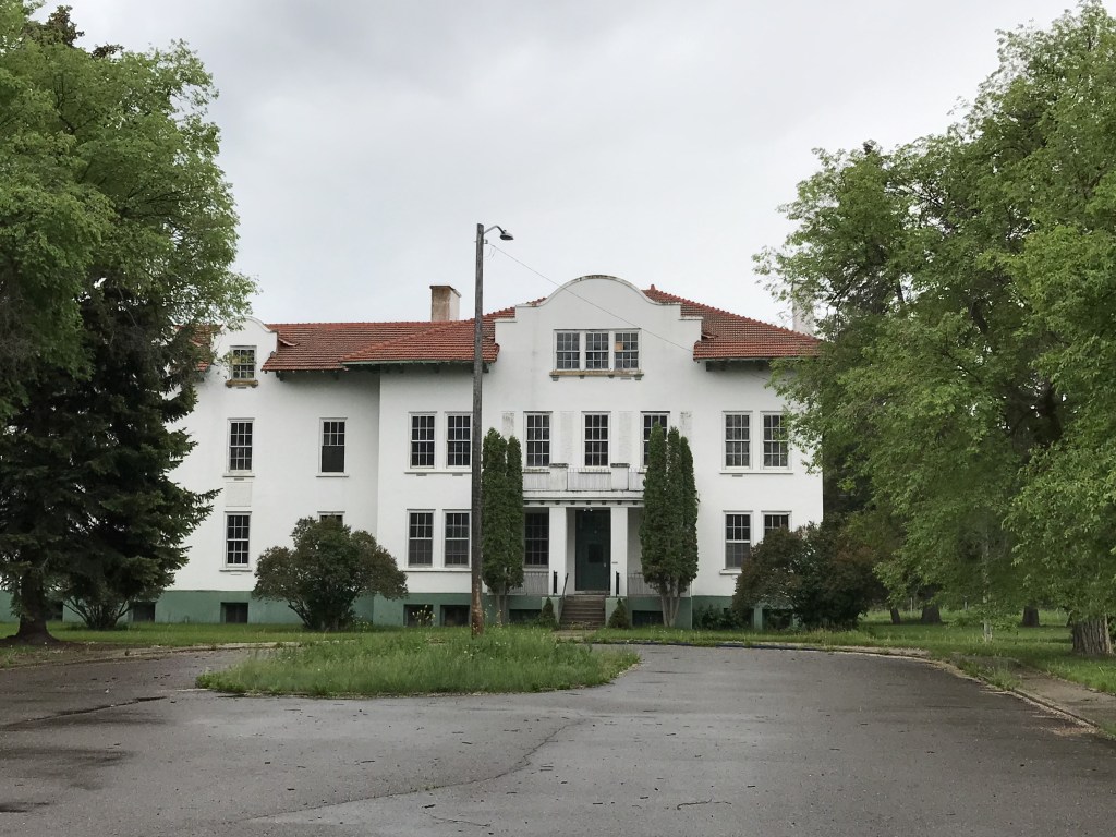 Carol Struckman and Kurt Fiedler, in grade school, were older than the others by four or five years and mostly unsupervised.  They spent days entering and exploring and vandalizing buildings, including the hospital.  They slid into the hospital basement through a coal chute, then found their way upstairs.  She and Kurt hoped to find medical paraphernalia or corpses, but they didn’t.  They systematically entered every unoccupied building except the explosive powder magazine near the Bitterroot River, although they tried and tried.  They got into the abandoned internees quarters through a trapdoor from a crawl space.   Again, no corpses. Below, the hospital as it appears now.