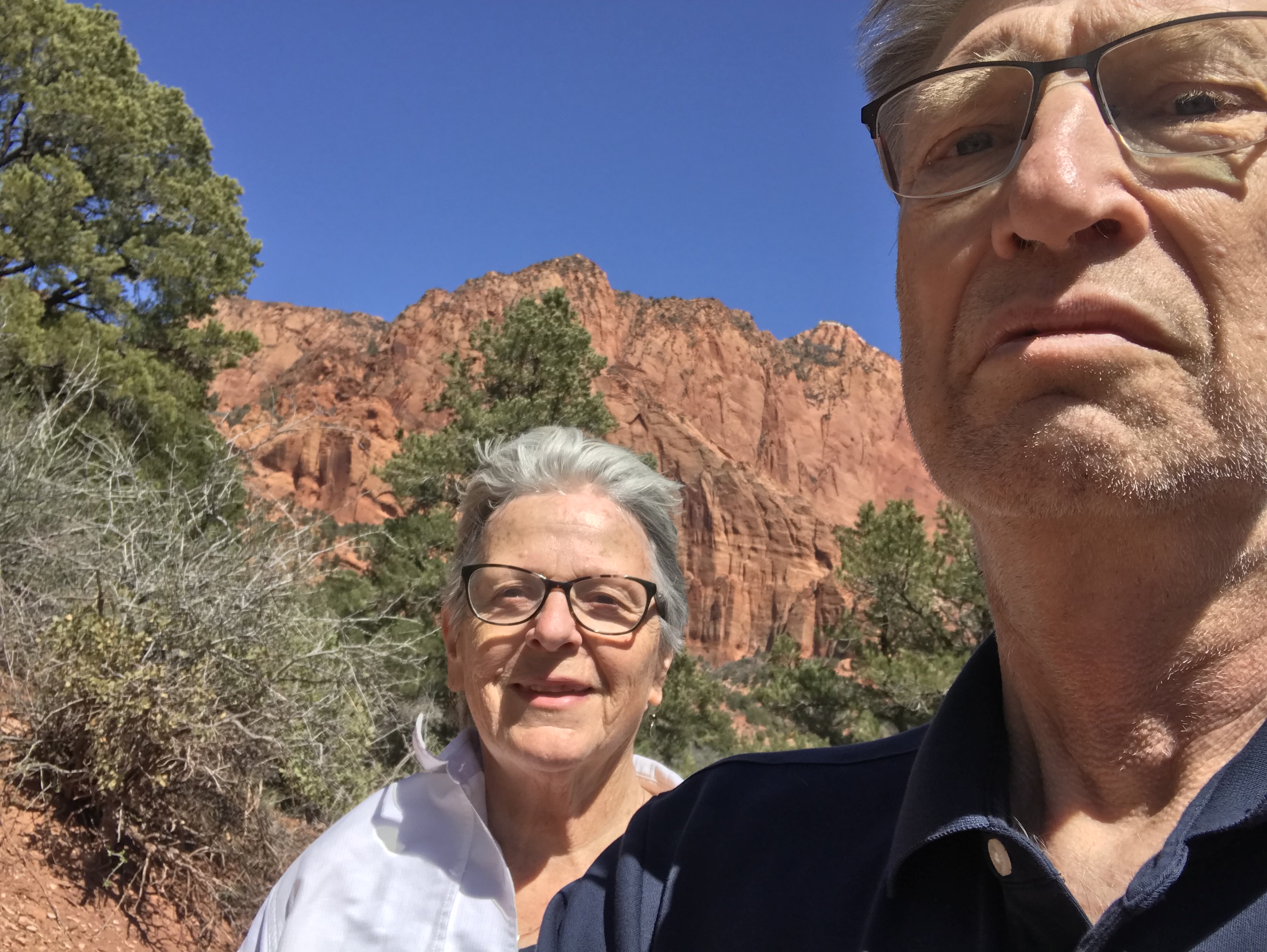 Our first night, near Saint George, was dusty because we camped near a dirt road. On a road, really. In the morning a line of volunteer firemen lugged ropes and gear to practice vertical rescues. We drove to Zion NP, hiked. Cy booked 2 campsites near Virgin, UT.